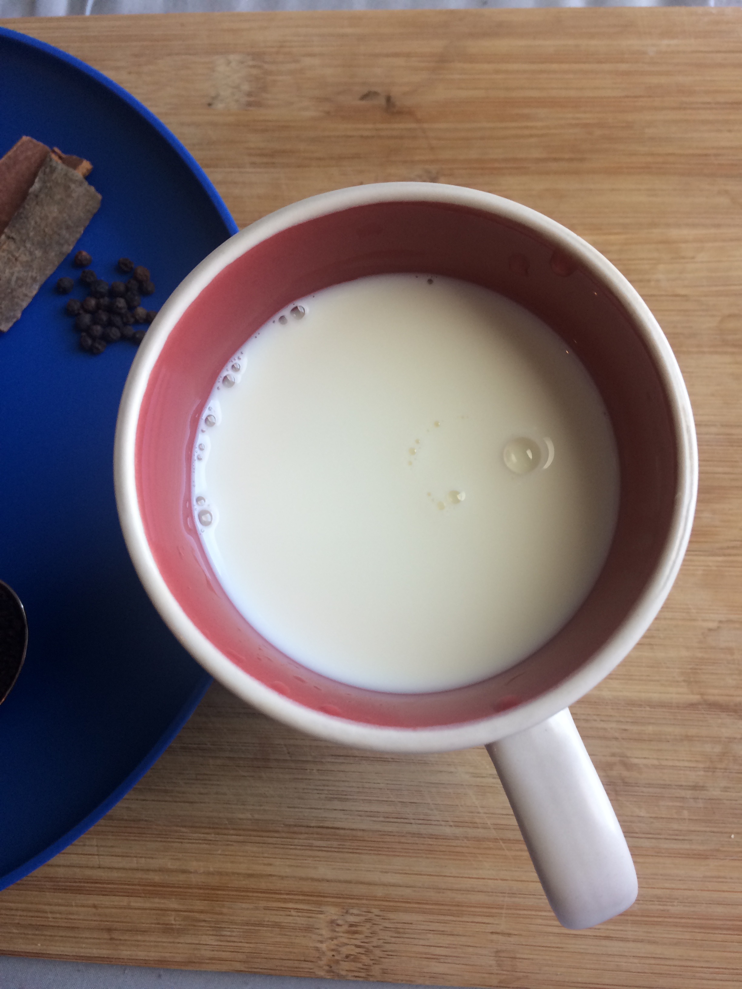 - Or, if you don’t feel like warming ½ cup of milk, like me, you can add the cold milk to the tea in the pan. Wait for it to start simmering. Pour through a strainer into a cup.